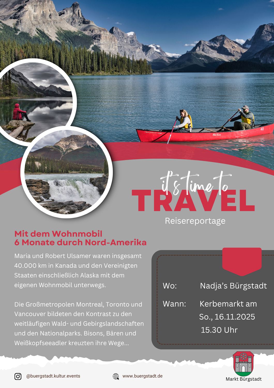 | 15.30 | Vortrag: „Mit dem Wohnmobil 6 Monate durch Nord-Amerika“ Referent: Robert Ulsamer |